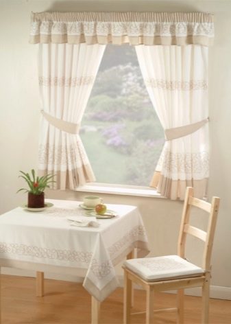 - Ако има маса пред прозореца, тогава най-добрият вариант би бил къси завеси с изрез във формата на арка върху тюл, така че седенето на масата да отваря изглед към улицата и да има безпрепятствен достъп до перваза на прозореца.