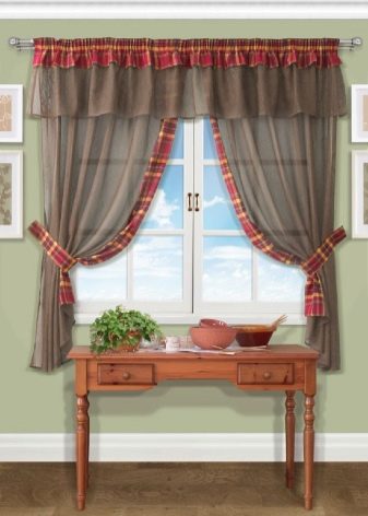 - Избор на цветове в съответствие със стила на стаята. Например, за високотехнологична кухня, завесите в студени нюанси са подходящи. За класиката са подходящи обикновени завеси от благородни цветове; тук е допустима и комбинация от цветове върху различни текстури, ако завесата се състои от няколко слоя. За селска кухня са подходящи кафяви, бежови, пясъчни нюанси, допустимо е да се използва орнамент под формата на цветя или клетка.