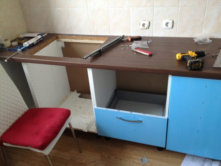 Модулните кухненски мебели се състоят от няколко структурни части, които трябва да бъдат свързани в правилния ред. Повечето производители изпълняват конструкции на шкафове по стандартни схеми. Това ви позволява да разработите оптимален алгоритъм за сглобяване на такива продукти. Такива операции се извършват ръчно въз основа на специална схема-план, която трябва да бъде включена в комплекта за всеки фабричен продукт..