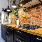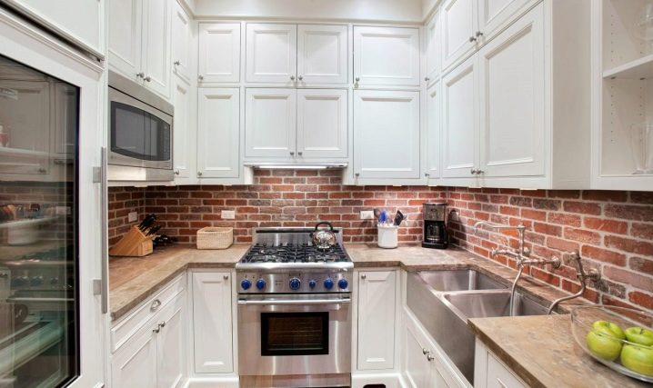 За довършване на каменна престилка може да се използва изкуствен или естествен естествен камък. И в първия, и във втория случай опциите за престилки за кухнята са напълно различни. Моделите с тухлена форма са много популярни. Тухлената зидария се счита за една от най -надеждните поради липсата на дори най -малката празнина между камъните..