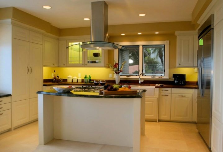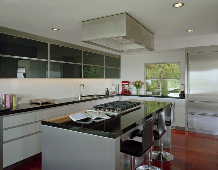 На острова са монтирани вградени домакински уреди, фризер, микровълнова фурна и задължителен елемент – островен абсорбатор. Тази кухненска конструкция не се монтира към стената, а към тавана и далеч от стените. Мястото за абсорбатора се избира, като се вземе предвид работната зона. Основната характеристика на дизайна е методът на закрепване. Качулката е фиксирана към повърхността на тавана. Не трябва да се опъва и окачва, тъй като теглото на островното устройство е повече от 30 килограма.