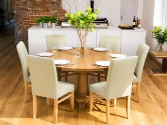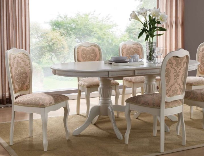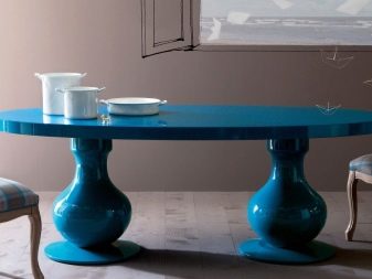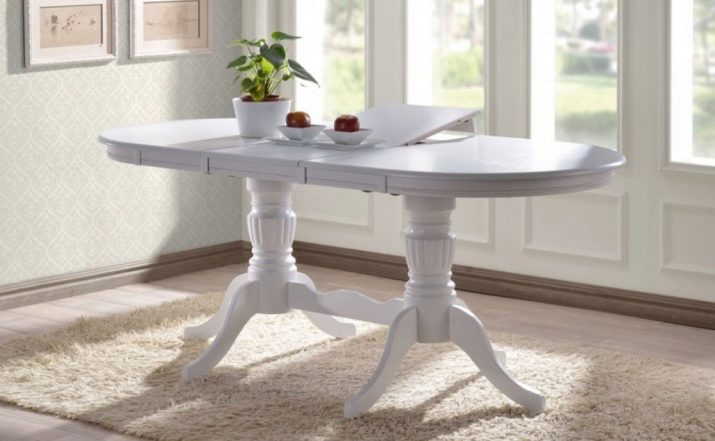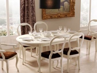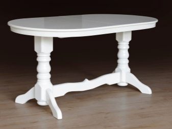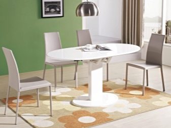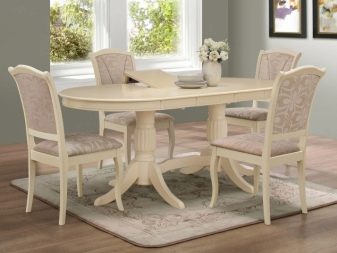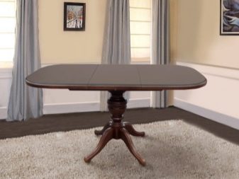 Овална маса на единия крак изглежда лаконична и скъпа; дизайнерите съветват да я комбинирате с масивни класически мебели в кухнята, за да завършите образа на стаята. Предимството на този модел ще бъде пространството под масата, което ще позволи на членовете на семейството и техните гости да останат възможно най -удобни..