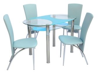 - Стъклото в основата на плота изглежда оригинално и леко, затова е избрано да допълни модерния просторен интериор на кухнята-хола. Металните крака придават на композицията здравина и елегантност, а прозрачният плот на масата – изтънченост и ефирност, лекота и спретнатост.