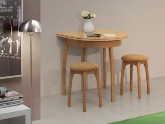 - Сгъваемите овални маси съчетават стилен дизайн и допълнителна функционалност поради сгъваема структура: зоната за оформление има параметри от 30-60 см, за да удвои плота на масата (маси за книги или трансформатори).