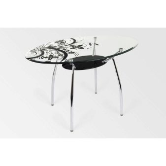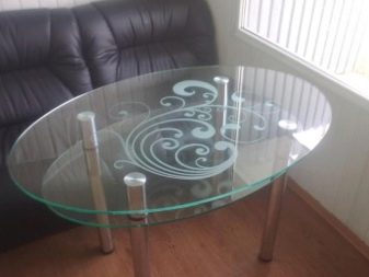 Цветът на стъклото обикновено се определя от самия клиент. Тя може да бъде прозрачна, матова, с фотопечат или цветен модел, както и с разнообразни шарки, които гравират повърхността на стъклото, което го прави още по -привлекателен и оригинален. Такава маса ще се превърне в украса на всяка кухня..