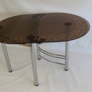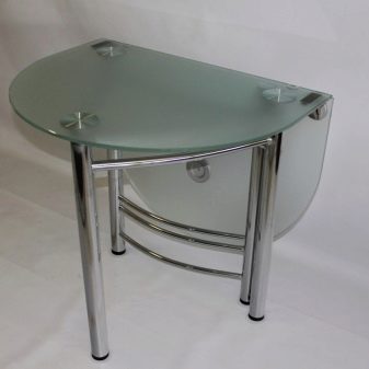 Сгъваемата маса беше предшественик на плъзгащата се маса у нас. Тази удобна мебел беше в почти всяко семейство. Овална сгъваема маса със стъклен плот ще бъде отличен вариант за малък апартамент, благодарение на способността да се сгъва компактно и да се побира дори в тясна пътека или на балкон. Често се използва като стойка или стойка за телевизор. Това е още по -удобно, тъй като не е нужно да търсите допълнително място за съхранение на този продукт..