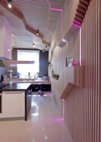 Например, пластмасовите панели могат да имат огледално или полупрозрачно покритие, което визуално придава обем на стаята. Интересно дизайнерско решение може да бъде използването на пластмасови или MDF панели, напомнящи за керамично, бамбуково, мраморно или метално покритие..