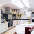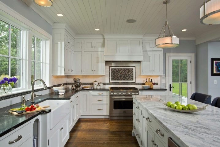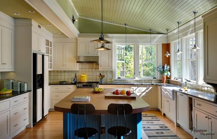 Особено внимание се обръща на покриването на тавана. Тя трябва да е непроницаема за влага, лесна за измиване и почистване от замърсявания, а също така да е устойчива на високи температурни промени. Наред с тези характеристики, таванът трябва хармонично да се вписва в интериора на стаята, допълвайки го.