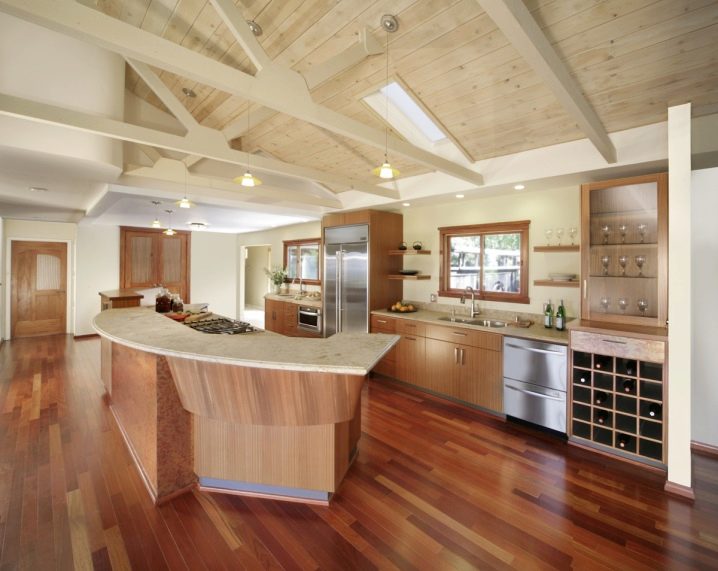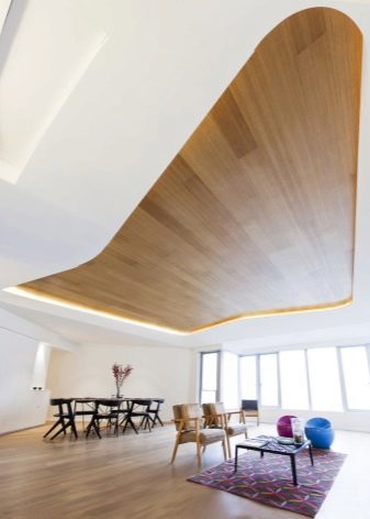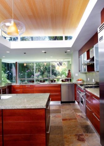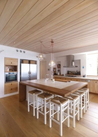 Популярни са и панели от дърво. Кухненското таванско покритие от MDF има специална обработка, така че да не се страхува от влага и изпарения. Таванът от MDF е по -издръжлив и естествен, не само на външен вид, но и по състав.