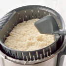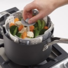 - Парна кошница, изработени от гъвкава пластмаса. В него се поставя храна и се поставя в контейнер, така че дъното на вложката да не докосва водата. Дръжките на устройството са огънати нагоре и по форма се превръща в кошница. Той има малък размер, така че няма да е възможно да се готви голямо количество храна в него наведнъж.