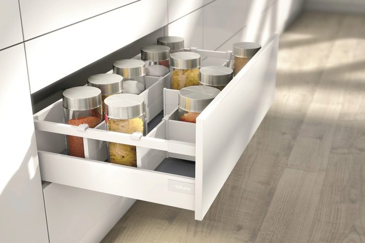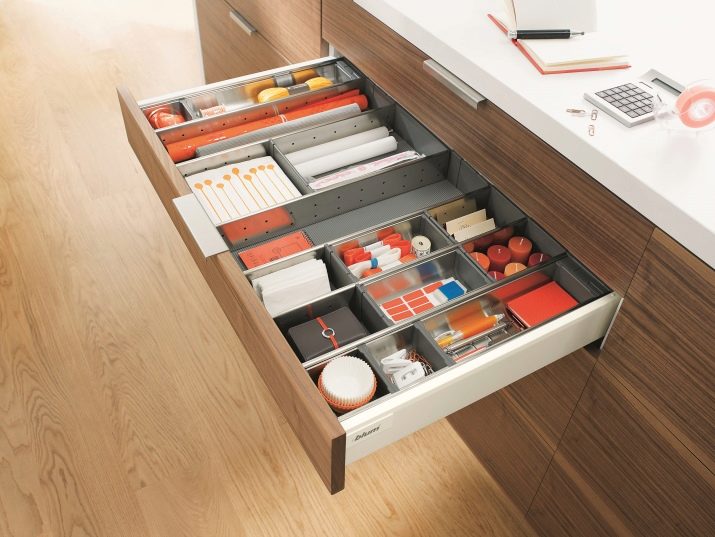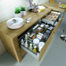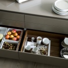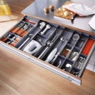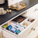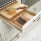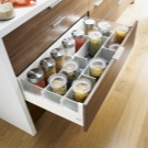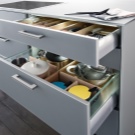 Много важен елемент от пълненето на кухненски шкафове, на чието присъствие трябва да обърнете внимание, когато купувате тази мебел, е сепаратор, друг вариант е поднос. Разделяйки кухненското чекмедже настрани и по дължина, те осигуряват ред в него. Бурканите и бутилките в такава кутия с разделители няма да се търкалят и да паднат случайно, когато изведнъж се извадят. Освен това, ако желаете, можете да пренаредите такива разделители и тави от място на място вътре в шкафа, правилно избраната им подредба ще осигури ред в кухненското чекмедже или шкафа..