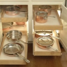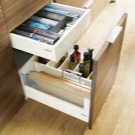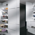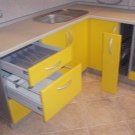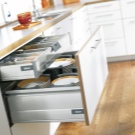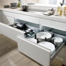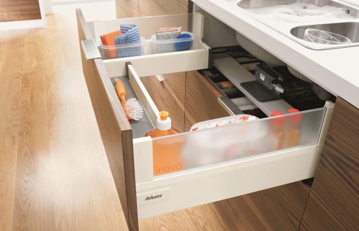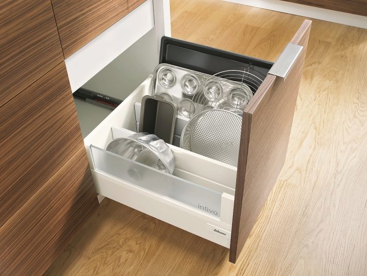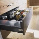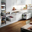За да се разшири полезното пространство на кухнята, е необходимо да се използват възможно най -много дълбоки чекмеджета с доста високи страни отстрани и отзад. Дайте предпочитание на по -широките чекмеджета, те са по -практични. Ако ги замените с две тесни чекмеджета, тогава преградата между тях ще заема допълнително място. Чекмеджетата за кухнята, които са по -тежки, най -добре се купуват с пневматичен механизъм. Когато изваждате такъв, дори абсолютно пълен шкаф, не е нужно да полагате допълнителни усилия..