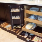 За да не усложнявате процеса на готвене в кухнята за домакинята, трябва да се придържате към няколко съвета, които ще ви помогнат да запълните правилно всеки кухненски шкаф. Вместо врати в долните шкафове, в долните шкафове трябва да се монтират чекмеджета, които трябва да бъдат напълно разкрити и в същото време такъв предмет трябва да е дълбок и просторен. Това подреждане на кутията ще позволи, когато се издърпа до края, да освети всичко, което е вътре. Домакинята няма да се навежда и да търси необходимите неща в тъмен килер, тъй като всичко ще бъде на видно място в точното време. Това е много удобна и функционална опция за пълнене на долния кухненски шкаф..