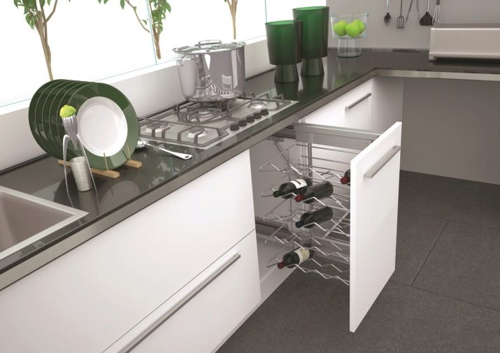 Отделението за бутилки в кухненските шкафове се нарича още държач за бутилки. Състои се от тесни отделения, във всяко от които може да се постави стандартна бутилка. В такъв шкаф бутилките са много удобно подредени в редове една над друга и една след друга. При тази подредба бутилките не се допират една до друга и следователно не могат да се счупят. Освен това, като отворите кутията с едно движение на ръката си, получавате достъп до всички съдове наведнъж..