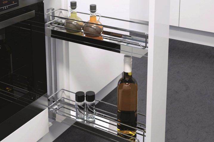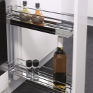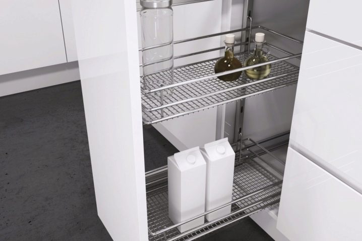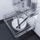 Този пълнеж в кухненския шкаф е друг вид мрежест контейнер. Той е идеален за шкафове, които са високо. Един стандартен кухненски шкаф може да побере шест от тези кошници. Дизайнът на колоната е прибиращо се устройство, което се плъзга върху специални топки. С едно движение на ръката си лесно можете да отворите такава кутия, така че цялото й съдържание да е на видно място и можете да получите всяко нещо без никакви проблеми..