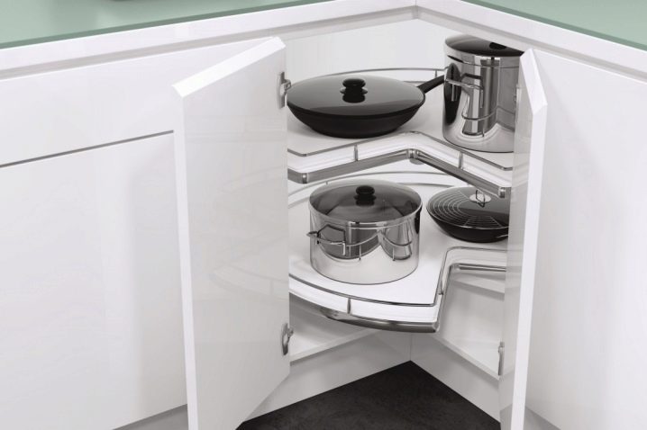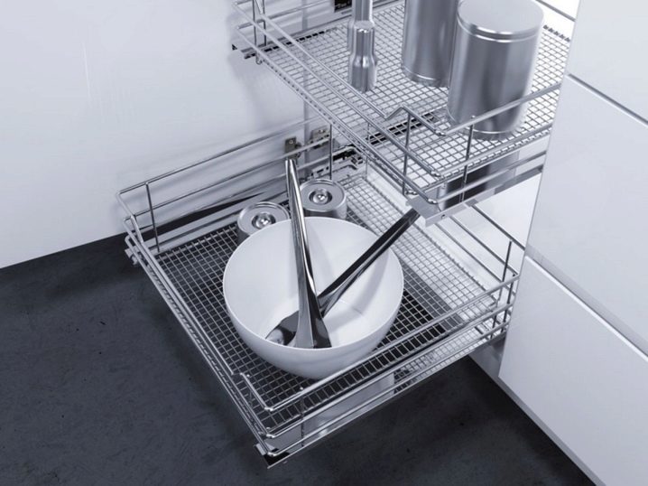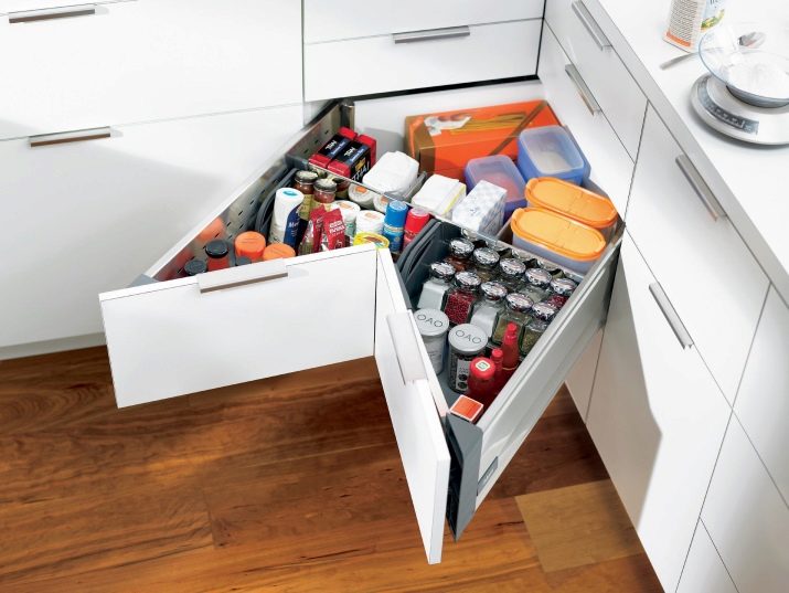 За ъглов шкаф с врата най -добрият вариант е да инсталирате секция с отворена врата. Ако сравним такова пълнене на кухненски шкаф с "въртележка", тогава е по -просторно. Дизайнът на такъв ъгъл е представен под формата на въртящ се механизъм, който свързва правоъгълни кутии. Приставката на чекмеджето е монтирана на вратата на кухненския шкаф, а предната част на чекмеджетата е прикрепена към вратата. Такива кутии имат мрежеста структура и следователно всичко вътре в тях е достъпно за преглед, лесно можете да видите и да получите нужното нещо. Когато затворите вратата на шкафчето, тези чекмеджета се заравят заедно с тях в правилния ред..
