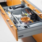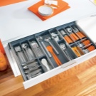 В допълнение към дренажа за съдове, пълненето на шкафа под формата на тави за лъжици, вилици и ножове е от съществено значение за кухнята. По правило всеки вид прибори за хранене има свое отделение. Най -удобно е да поставите такива тави в чекмедже, което се намира в плота на кухненския модул. Броят на отделенията за съхранение на прибори за хранене ще зависи от това колко голямо е вашето семейство и колко често сте домакин. Размерите на такъв шкаф ще зависят пряко от пълнежа: за голям брой тави и отдели избираме по -просторни шкафове.