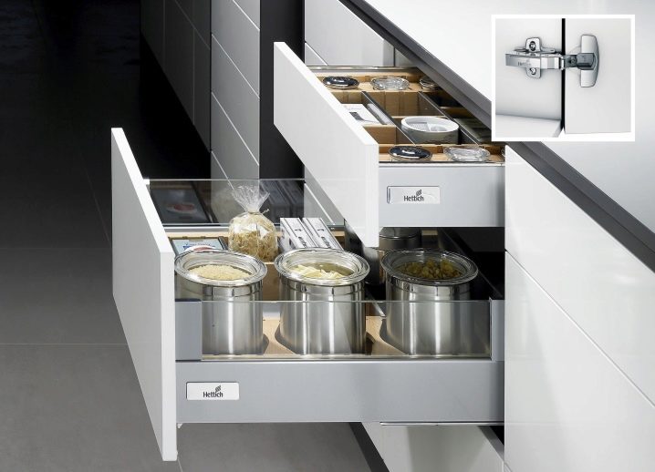 За да не заредите кухненския комплект с ненужни елементи, по -добре е да скриете няколко чекмеджета едновременно зад една фасада. Интересно съвременно решение са шкафчетата, на които изобщо няма дръжки. Те имат специален механизъм, благодарение на който могат да се отварят с натискане на бутон. Той е много удобен и не изисква излишни усилия и грижи..
