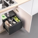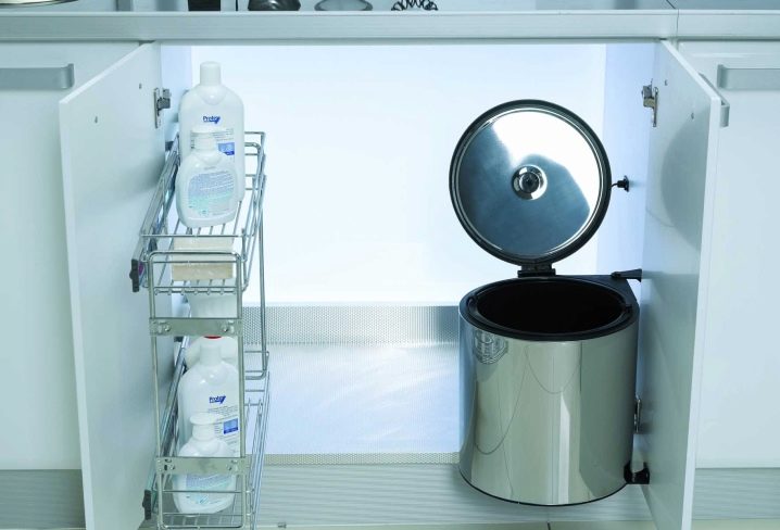 Благодарение на съвременните технологии, кошчето може лесно да бъде интегрирано в кухненския шкаф. Този дизайн изглежда много спретнат и естетически приятен, удобно е да го скриете от любопитни очи. Има дори такива устройства, при които при отваряне на вратата на шкафа, в която е вградена кофа за боклук, кофата се отваря автоматично. И когато затворите шкафа, той се затваря сам. Има и вградени кошници за отпадъци с педал.