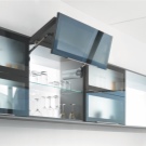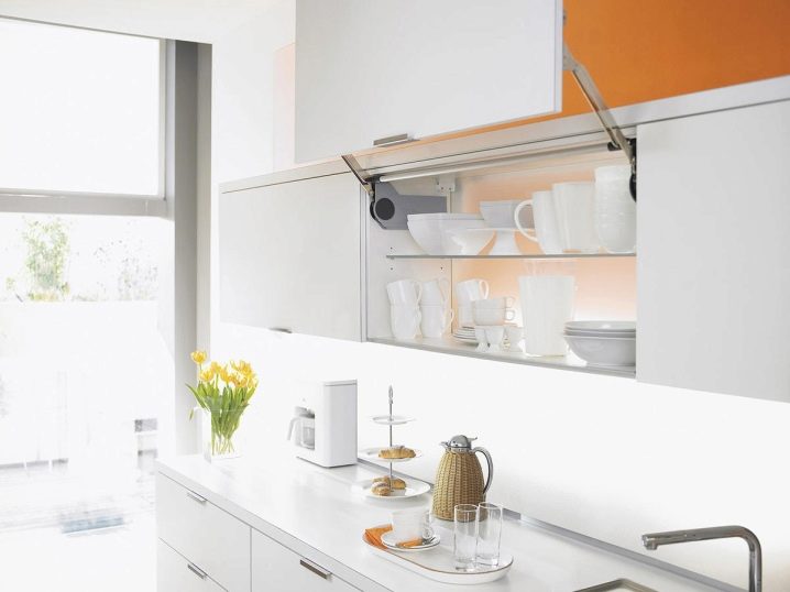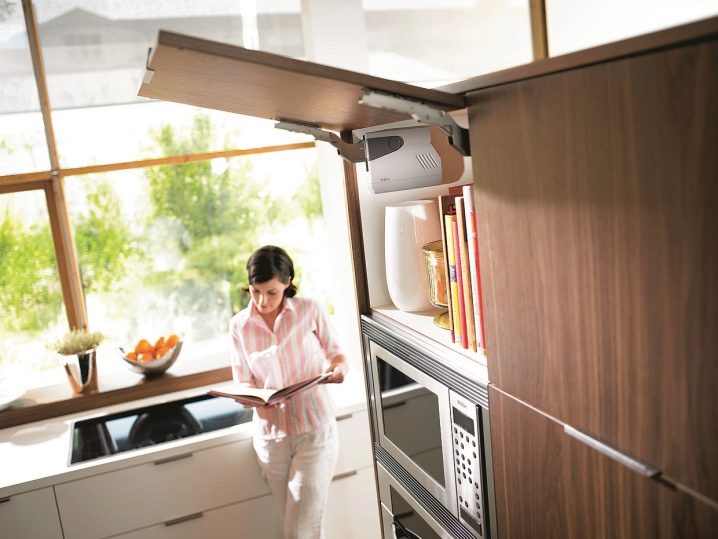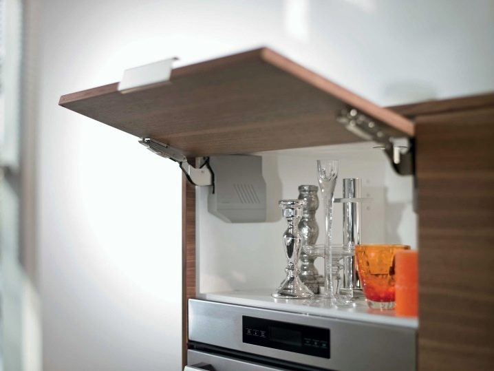За кухненските шкафове с хоризонтална врата най -незаменимият дизайн е асансьор, в противен случай такова устройство се нарича асансьорен механизъм. Вратите на такъв шкаф заемат много малко място, отварят се нагоре и изобщо не пречат по време на готвене. Този дизайн има специално заключващо устройство, което може да държи вратата отворена за дълго време, повдигната нагоре.