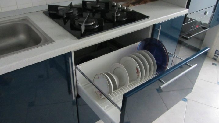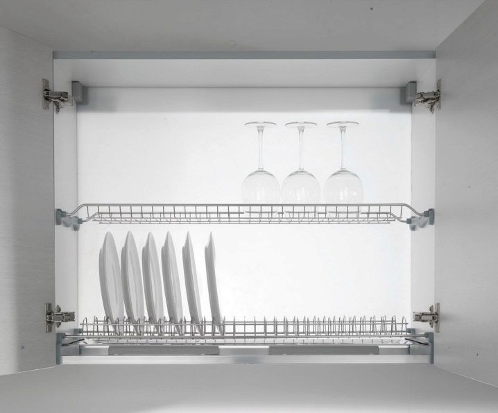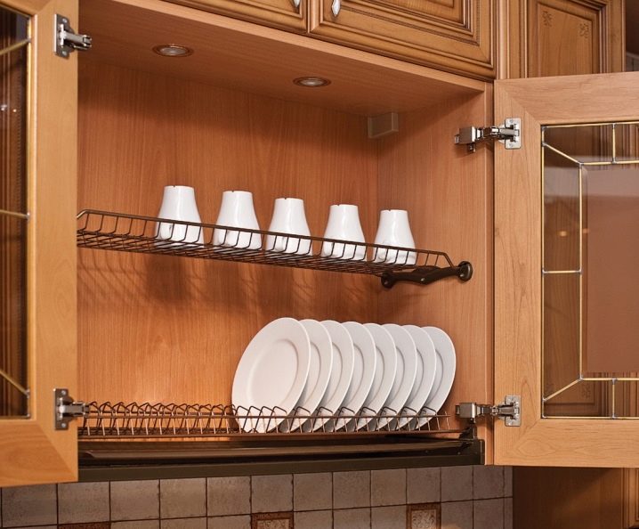Цедка за съдове е един от най -незаменимите елементи в кухнята. Може да се постави вътре в шкафа или отделно. Много е удобно, когато такава сушилня е вградена в ъглов стенен шкаф, разположен над мивката. Водата тече от прясно измитите съдове директно в мивката, не е нужно да избърсвате съдовете и други съдове, просто трябва да я поставите в отделенията на такава сушилня. По правило такъв елемент от шкафа е много издръжлив, тъй като те трябва да бъдат надеждни и да издържат на теглото на всички съдове. Най -често срещаните сушилни за съдове за метал или пластмаса.
