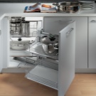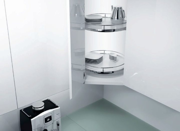 За кухня с малка площ най -подходящият вариант е ъглово завъртане "въртележка". Този елемент ви позволява по -удобно да използвате шкафчетата, разположени в ъгъла, тъй като като завъртите такава въртележка, ще направите лесно достъпни дори най -отдалечените неща. По този начин можете да достигнете до неща, които се намират дори в най -отдалечения ъгъл. Дизайн "въртележка" представлява оста, по която се въртят полукръгли рафтове. Радиусът на такъв продукт е двеста и седемдесет градуса..