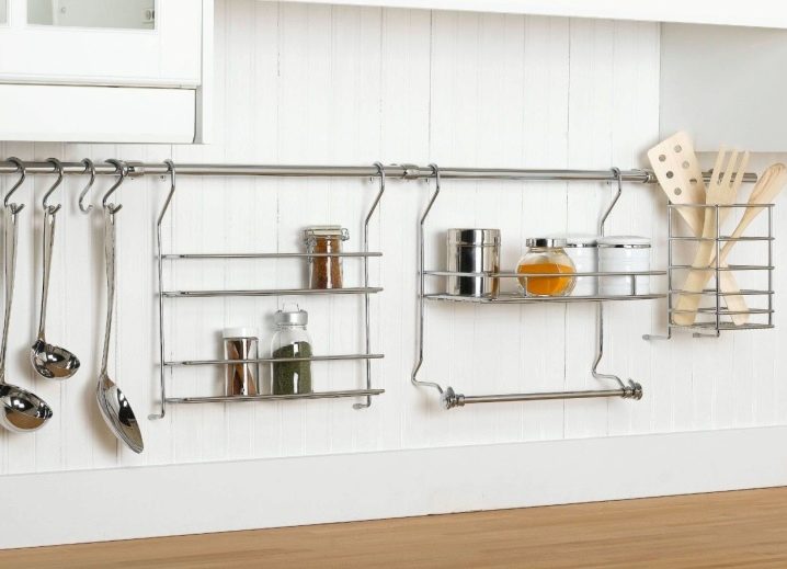Такава система за пълнене на шкаф е много удобна. Това е метална тръба, към която са прикрепени държачи за всички необходими предмети, като шпатули, лъжици, химикалки, ренде, буркани с подправки и много други неща. Такава система се поставя или вътре в шкафа, или отделно от него. Парапетното пълнене позволява много функционално използване на пространството и спестява място. Такъв елемент, поставен на стената, може дори да действа като декорация за интериора на кухнята..