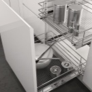 Дизайн "въртележка", като правило те се монтират вътре в кухненски шкаф и ако в шкафовете няма свободно място, може да се фиксира към стената на тази мебел. Това е много универсален продукт, който заема много малко място и в същото време заетото пространство се консумира възможно най -функционално. Завъртане "въртележка" може да се прикрепи както към горни, така и към долни кухненски шкафове. Той е доста просторен и в него можете да поставите всякакви съдове и кухненски прибори..