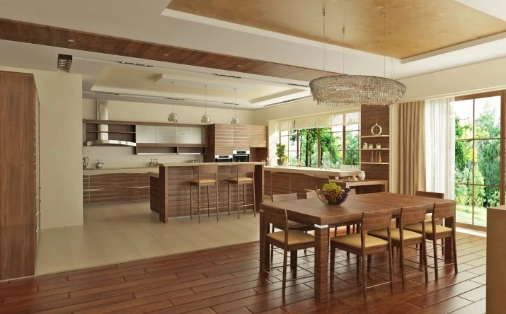Много интересно зониране с плочки и ламинат може да се направи в стая с голяма площ, например в студио апартамент или при комбиниране на кухня и трапезария. Ако имате на разположение площ от 33-34 квадратни метра, можете да я разделите на няколко визуални зони, като използвате интересна комбинация от материали; дори е възможно да се комбинират три материала: линолеум, ламинат и плочки. Във всеки случай вземете предвид всички характеристики на избраните материали, обмислете всички детайли – къде е най -доброто покритие, как да изберете правилните цветове и текстури. С правилния подход ще успеете и подовата настилка ще ви служи много години..
