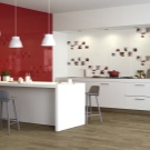 - Обърнете внимание на структурата на избраната плочка. Остъклените плочки са подходящи за стени – те могат лесно да се измият от всякакви замърсявания, мазни ивици. Най -добре е да поставите плочки на пода с текстурирана повърхност, за да предотвратите подхлъзване. Между другото, подовите плочки в кухнята могат да се комбинират с ламинат, като по този начин разграничават помещението в работните и трапезариите – в този случай плочките ще се поставят в зоната за готвене;