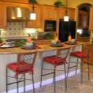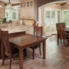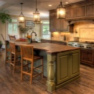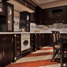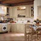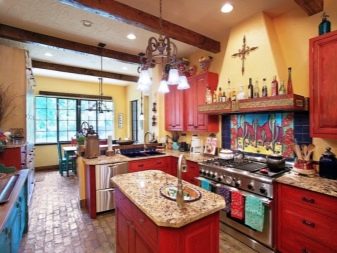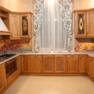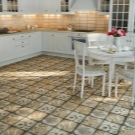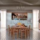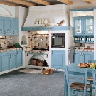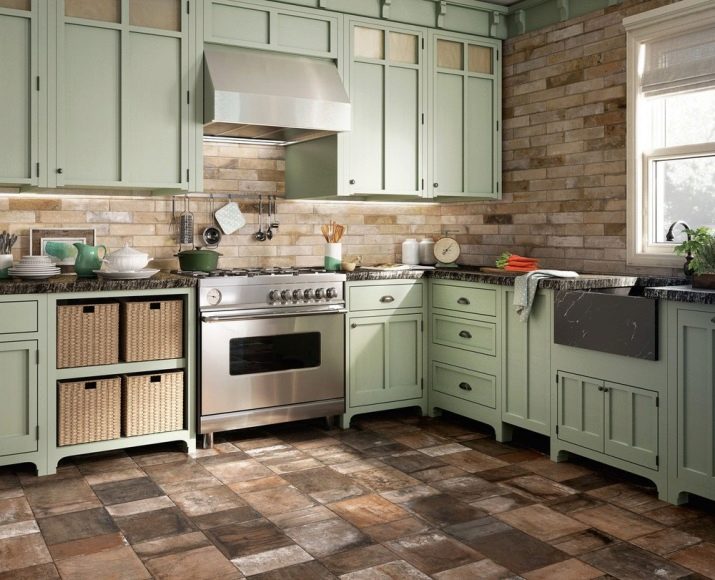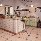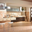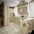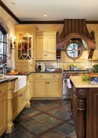 Интериор, декориран в стила на страна. За създаването на този стил обикновено се използват бежови, златисти, тъмнокафяви материали, възпроизвеждащи камъни с естествен произход, както и древни орнаменти. В този случай на пода трябва да се поставят изкуствено състарени плочки.. За да проектирате престилка, можете да изберете модел, съставен от средно голям камък с неравности. А на пода може да има изображение на различни естествени мотиви..