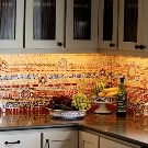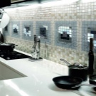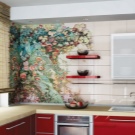 Панел, поставен върху мозаечна стена, ще изглежда много оригинален и смел. В същото време, както отбелязват дизайнерите, мозайката върви добре с обикновена плочка със съгласен цвят, обикновен размер. Алтернативен вариант на панела за плочки могат да бъдат специални винилови стикери за плочки. Такъв аксесоар ще изглежда много впечатляващ, а също така е в състояние да прикрие различни дефекти: чипове или драскотини по плочката..