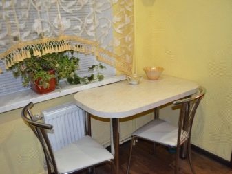 Това решение ви позволява не само да получите оригинална мебел, но и значително да спестите място. В края на храненето столовете могат да бъдат напълно прибрани и самият той се превръща в работна повърхност, на която можете удобно да поставите необходимите кухненски прибори и дори да ги използвате като работна повърхност.