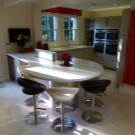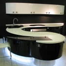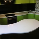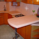 - Надлъжна маса с тесен, заоблен плот. Тази опция не е толкова широко разпространена като предишната, но може да бъде отлично решение за тясна и дълга кухня. Перфектно в хармония с надлъжното разположение на кухненския блок по една стена, той създава ефекта на целостта на пространството и го обединява в един общ ансамбъл.