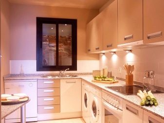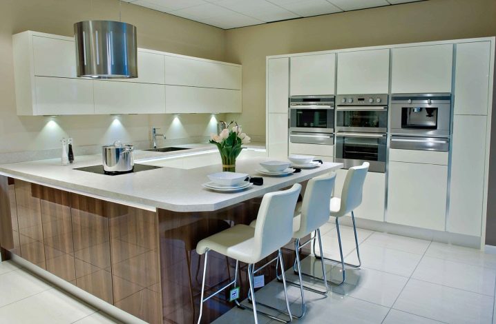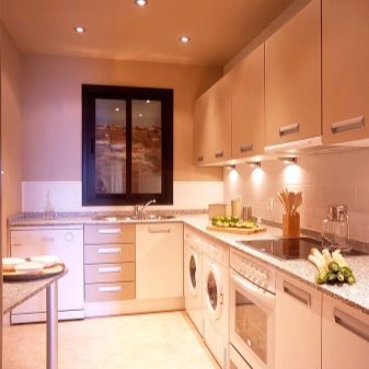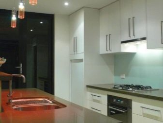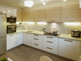 Едно от най -необичайните решения е поставянето на осветление под шкафовете по цялата дължина на слушалките. Този метод създава ефекта на “плаващите” мебели, които винаги изглеждат много оригинални.