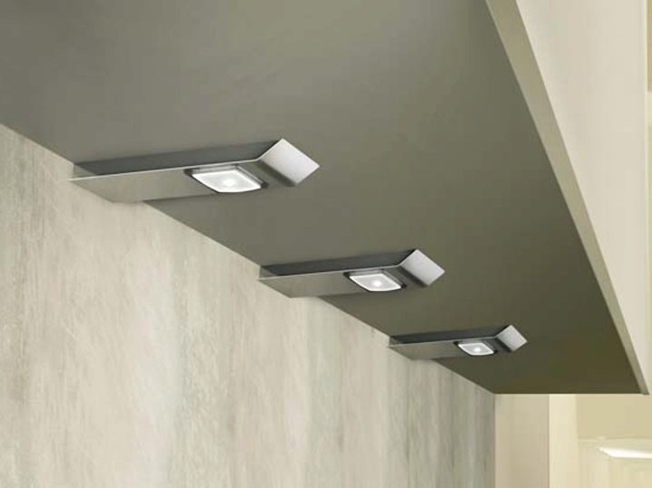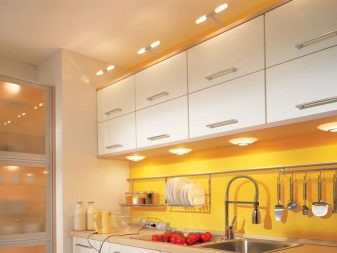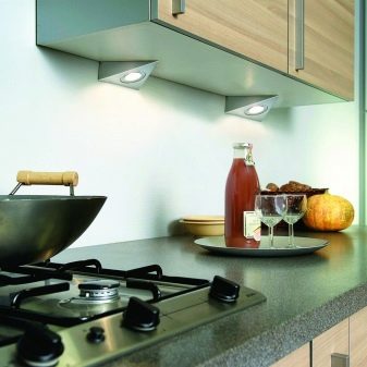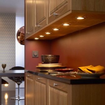 - Под стенните шкафове. Основното местоположение, много удобно за работната зона. Осветителните тела се монтират в ъгъла между долната повърхност на шкафа и престилката, в средата на долната повърхност или по -близо до ръба, в зависимост от ширината на шкафа и тяхната мощност.