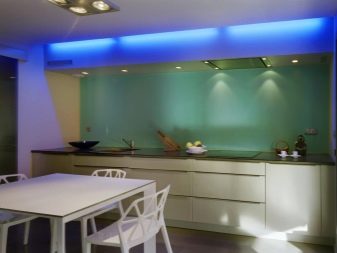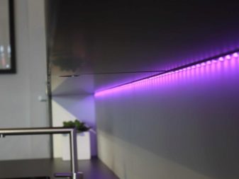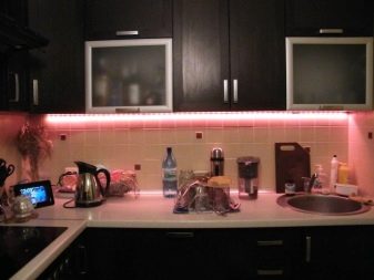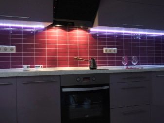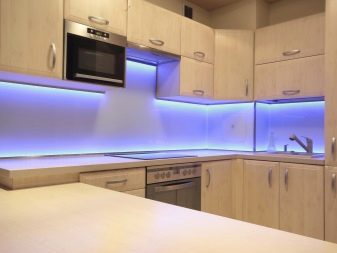 В допълнение към прожекторите и линейните светлини, като подсветка често се използва конвенционална LED лента. Може просто да се залепи под стенните шкафове по цялата дължина. Това е най -евтиният и лесен за инсталиране вариант, освен това лентата издържа много дълго време, абсолютно не се страхува от влага в кухнята и съществува в голям асортимент от цветове, което ви позволява да създавате най -оригиналните светлинни решения.
