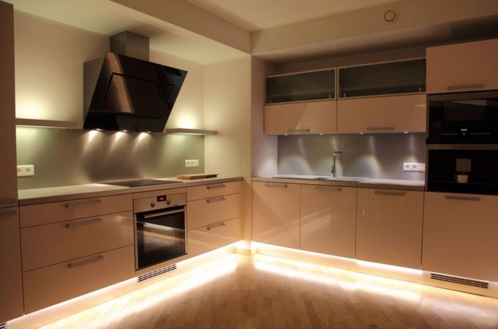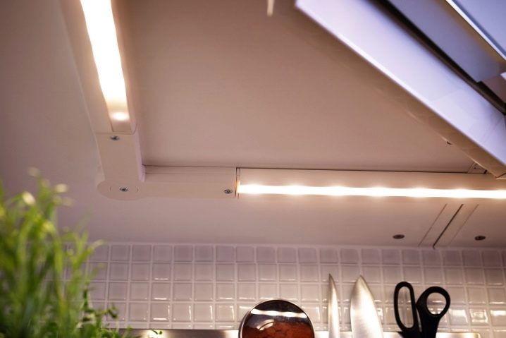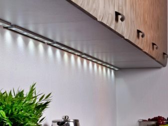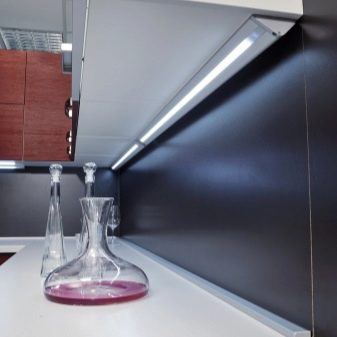 Основното предимство на LED осветлението под кухненските шкафове е лекотата на местоположение. Намирайки се под нивото на очите, светлината няма да заслепява и в същото време равномерно ще осветява работната повърхност. В сравнение с конвенционалните лампи, те се характеризират с ниска консумация на енергия.