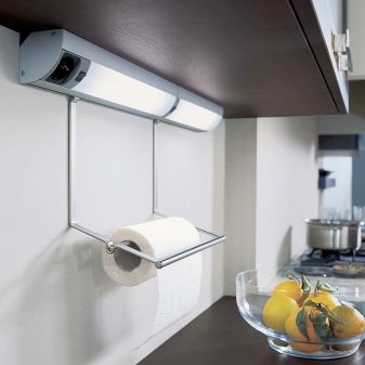 Отлично решение за осветяване на работната зона е лампата за кухненски шкафове Fraga. Това е чувствително на допир линейно устройство с еднакво разположени светодиоди (от 12 до 18, в зависимост от дължината). Такава лампа има доста висока цена (от 2000 рубли), но в същото време отговаря на всички изисквания за осветяване на кухненски плот.