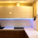 Ако имате престилка в светли цветове, облицована с плочки в кухнята си, тогава LED ленти, фиксирани под стенните шкафове и на повърхността на горните шкафове, ще създадат ефекта на светеща стена, която визуално ще разшири пространството.