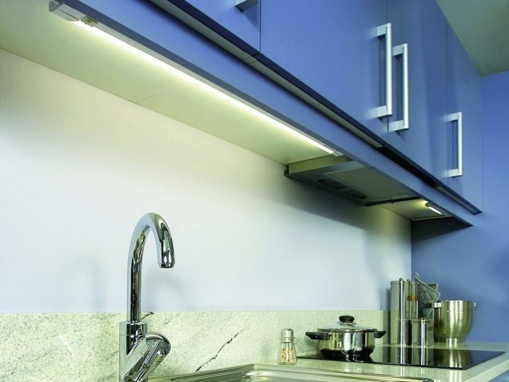 - Под горните шкафове над мивката. При това подреждане е важно да се вземе предвид, че подсветката не заслепява очите и самата лампа не се страхува от влага и пръски..