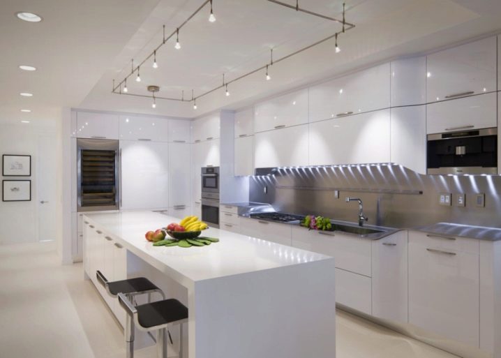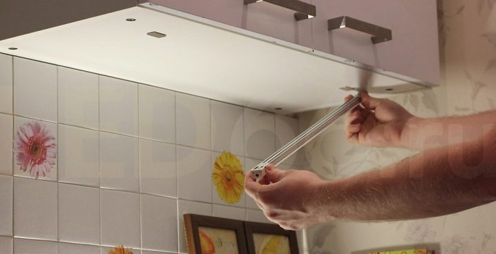 - Над стенните шкафове. Осветителните тела са инсталирани в специален панел и могат да се използват като основен източник на светлина.