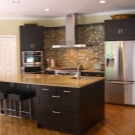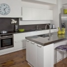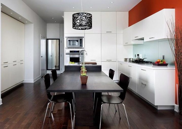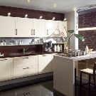 Тази опция ще изглежда добре в кухня в стил таванско помещение; боядисани дървени кутии, голяма масичка от масивно дърво или бар плот с осветление под формата на висящи лампи-прожектори ще допълнят дизайна..
