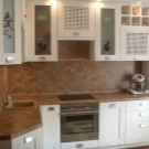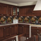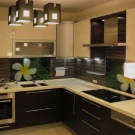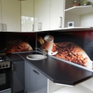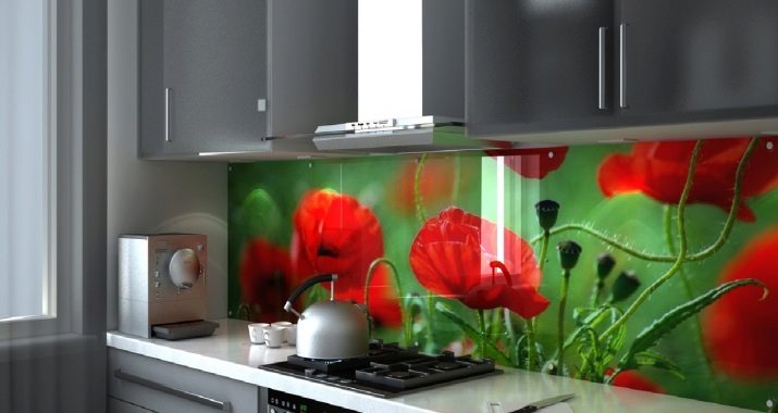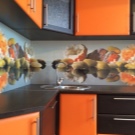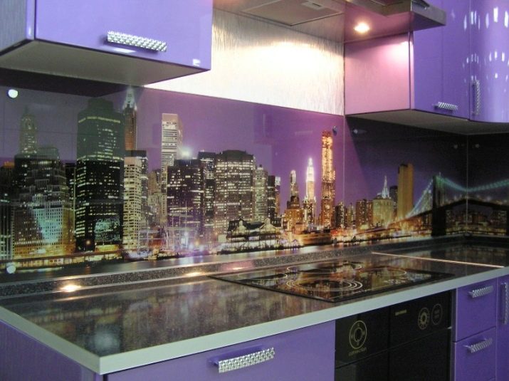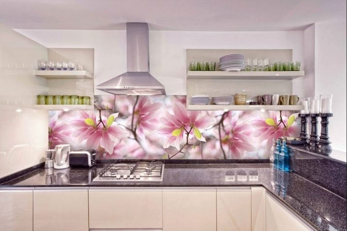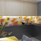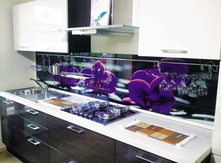 В онлайн магазините престилките се продават с готов модел, можете да направите и изключителен панел по поръчка. Изображенията на красиви сладкиши, френски кифлички, сочни плодове изглеждат добре, такъв модел несъмнено ще предизвика апетит. В допълнение към гастрономическото изобилие, можете да изберете опцията с изображението на морето, цветята на сакура или модел с орхидеи. Класическата версия е мостри с тухлен или мраморен модел.