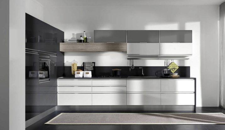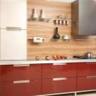 Високотехнологичната кухня ще бъде украсена с престилка с прост геометричен модел. Можете да изберете монохромно или да поставите цветни ивици на черен фон. Такъв ярък акцент трябва да бъде допълнен само с малки детайли, под формата на възглавници за столове или салфетки от плат. Останалата част от интериора е най -добре направена в светли, сдържани цветове..