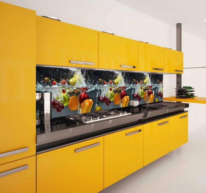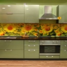 Панел с прекалено ярък фотопечат може да претовари интериора. Тази опция е подходяща само ако останалото кухненско пространство е направено в сдържани цветове. На твърде тъмна повърхност петна и повреди ще бъдат по -забележими, а лека престилка визуално ще разшири пространството.