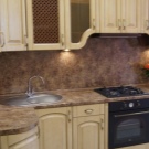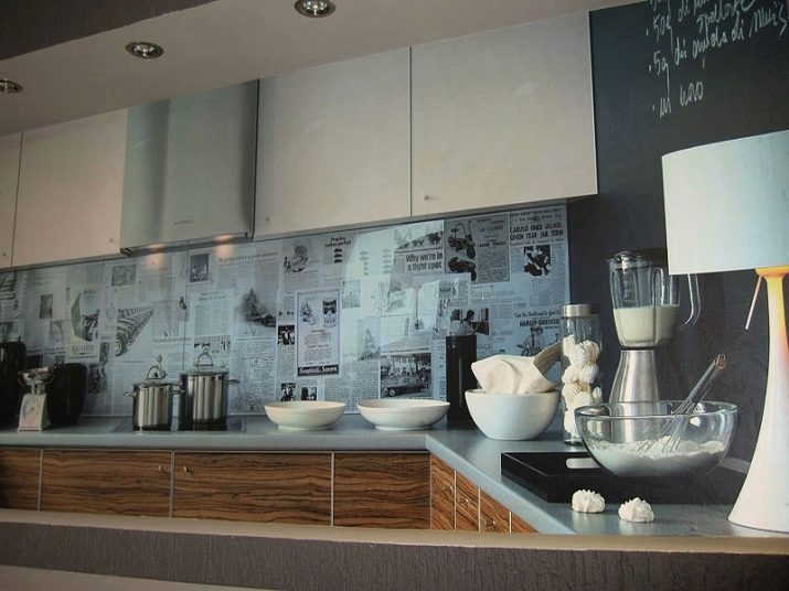 Тук въображението е безгранично, кухненска престилка може да бъде украсена с гигантска снимка на плодове или приятен пейзаж. Повърхността с имитация на мрамор ще изглежда страхотно.