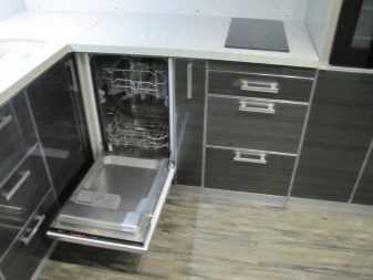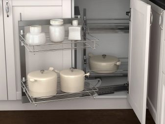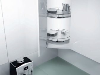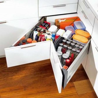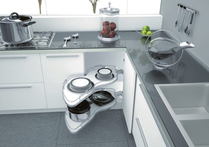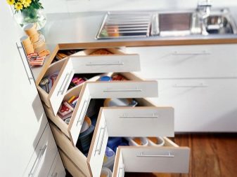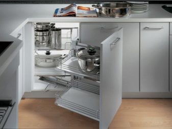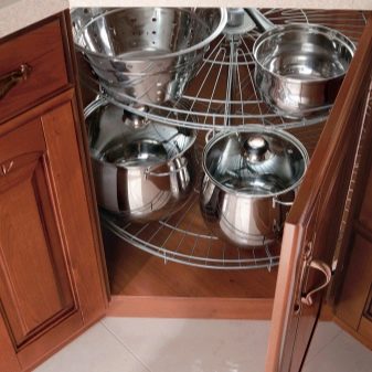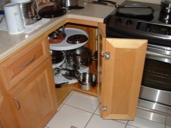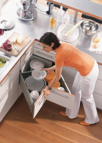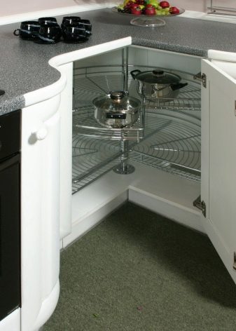 В зависимост от тяхната конфигурация, съдовете, кухненските прибори, храната и дори уредите с малки размери се поставят в ъглови шкафове на горното ниво, в зависимост от тяхната конфигурация. Модулите на долния ъгъл често се използват за битови нужди, но най -квалифицираните майстори превръщат тази недостъпна зона в ниша за уреди като съдомиялна машина или пералня..