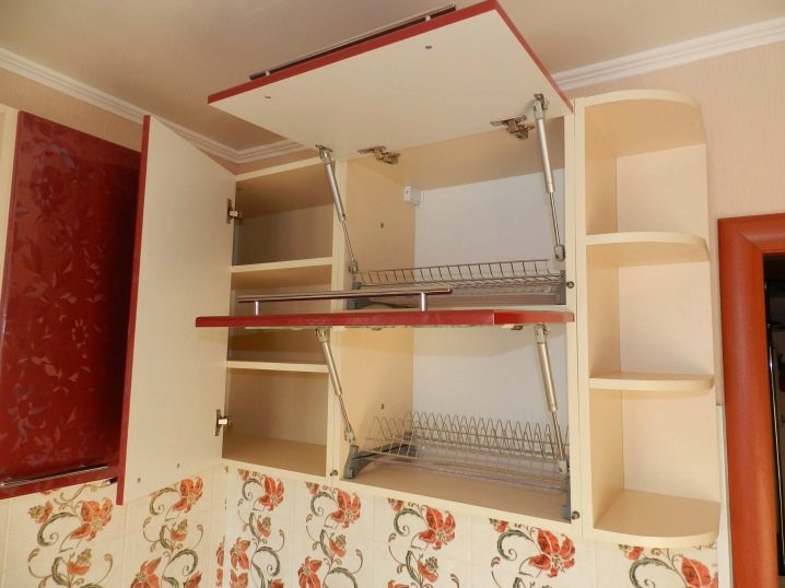 Горният шкаф обикновено съдържа съдове (ако се намира над мивката); има случаи на използване като съхранение на храни и подправки.