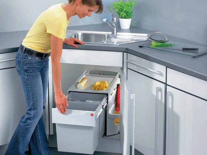 - В него е инсталирана кухненска мивка, така че долното пространство на такъв дизайн често се използва само за съхранение на кофа за боклук и други битови аксесоари. Факт е, че основното място в долния шкаф е заето от тръбопровода, оставяйки малко място за въображение..